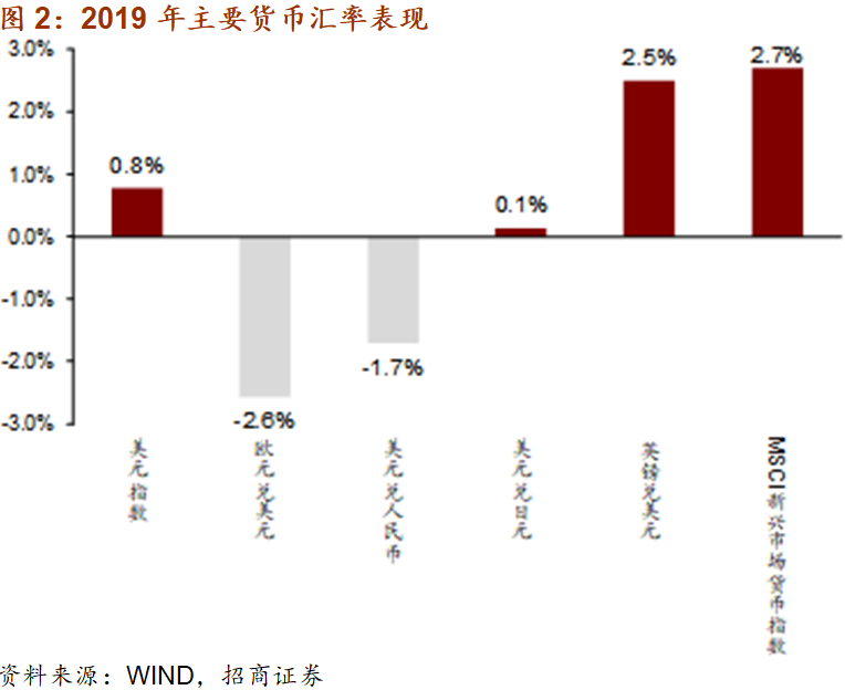 2019年,全球主要货币汇率整体在较窄的区间内波动。美元指数先升后降,截至12月27日,美元指数收于96.92,较年初的96.17上升0.8%。欧元表现较弱,相对美元贬值2,6%至1.12,英镑升值2.5%至1.31,日元升值0.1%至109.41,人民币汇率先升后贬,较年初水平贬值1.7%至7.00,MSCI新兴市场货币指数上升2.7%。