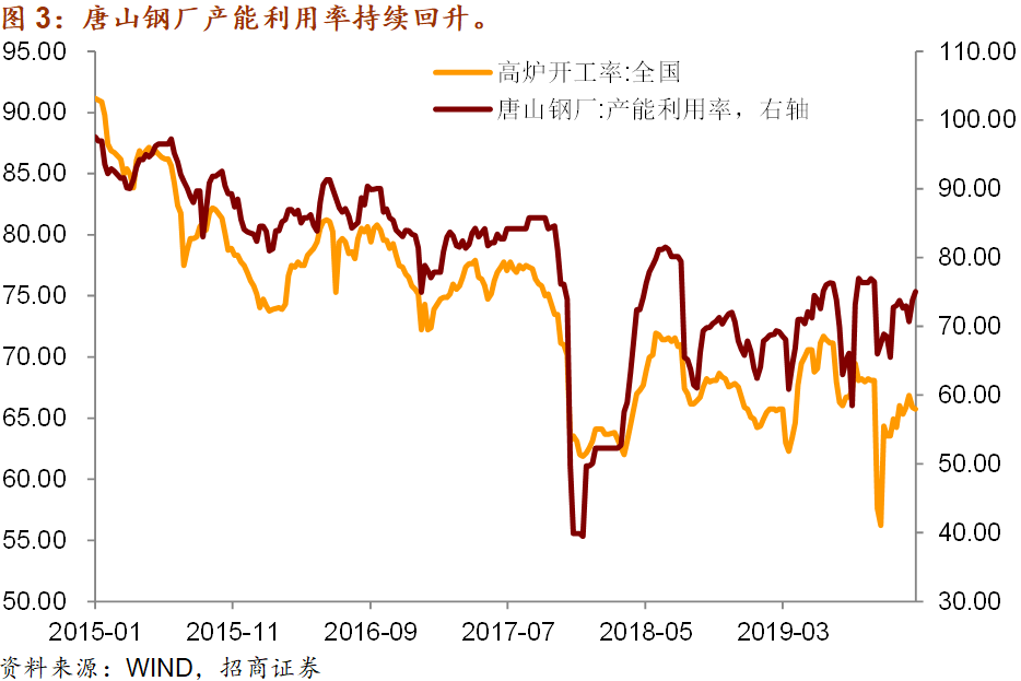 11月以来唐山钢厂产能利用率明显提高,这一趋势延续到12月。上周的产能利用率水平已经达到75.06%,不但是4季度的高点,也明显好于去年同期水平。这可能有两方面的原因,一是环保限产压力下降,二是需求水平的改善。目前现货螺纹钢价格已经连续5周维持在4000元/吨以上,螺纹钢库存不足300万吨,低于去年同期水平,而重点钢厂粗钢日均产量自10月下旬以来增速明显回升,从0.1%加快至5.9%。